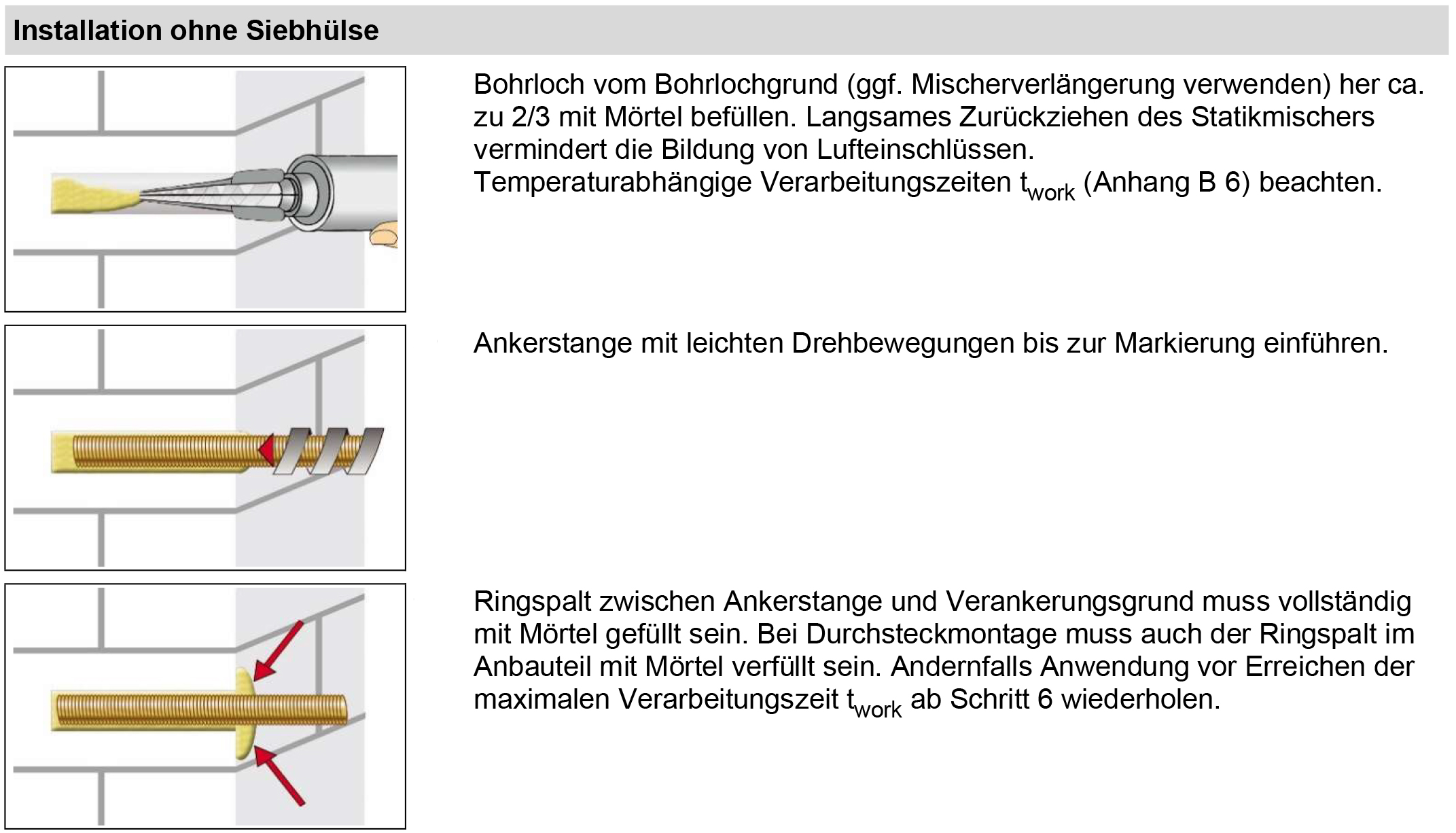 - geeignet für wassergefüllte (kein Seewasser) Bohrlöcher in Beton