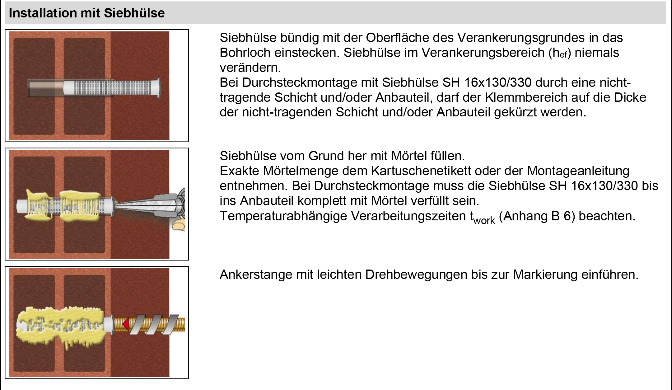 - Zulassung für Lochstein, Vollstein, Porenbeton, Porotonstein, Hohlkammerstein (Mauerwerk) M8 -M16